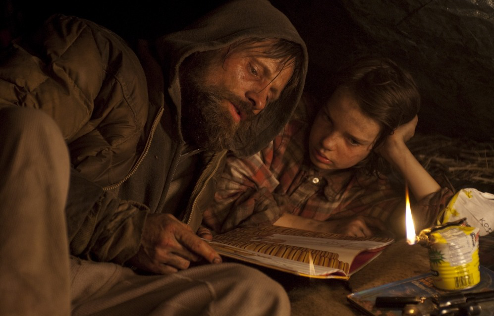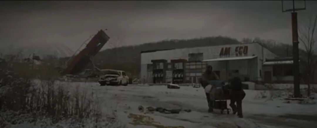 超市,加油站,脚下是旧日生活残留下的痕迹,车,钱,尸体都躺在厚厚的灰尘中,父子两人就是在这样一个地方寻找残存的食物,御寒的衣物和鞋子。