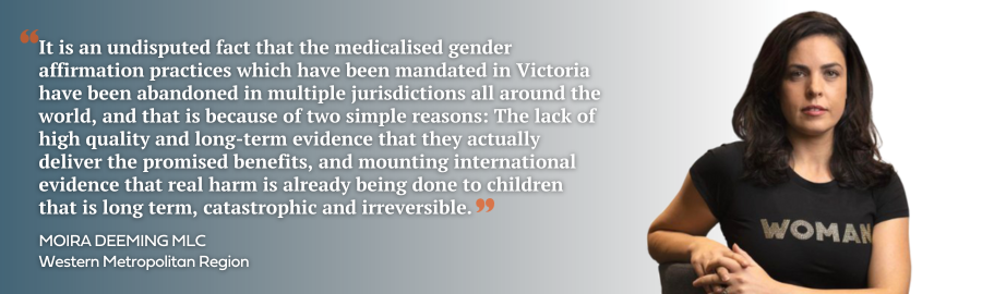As she rightly raised, it’s undisputed fact that the medicalised gender affirmation practices mandated in Victoria have been abandoned in multiple global jurisdictions, for two simple reasons: